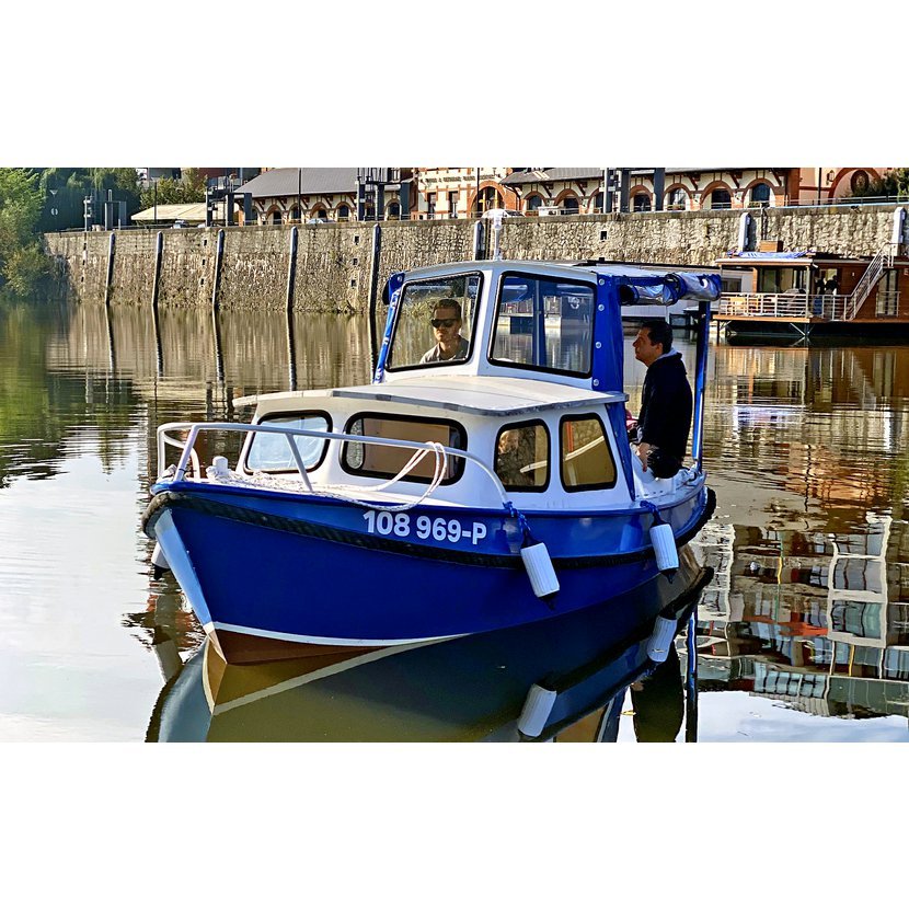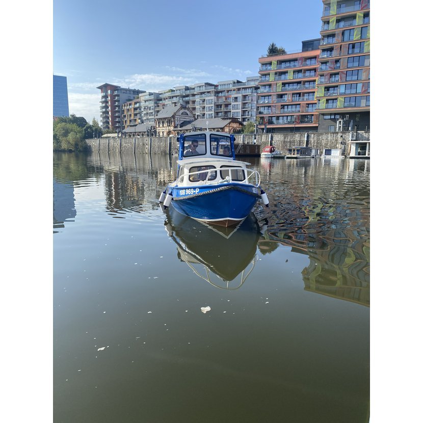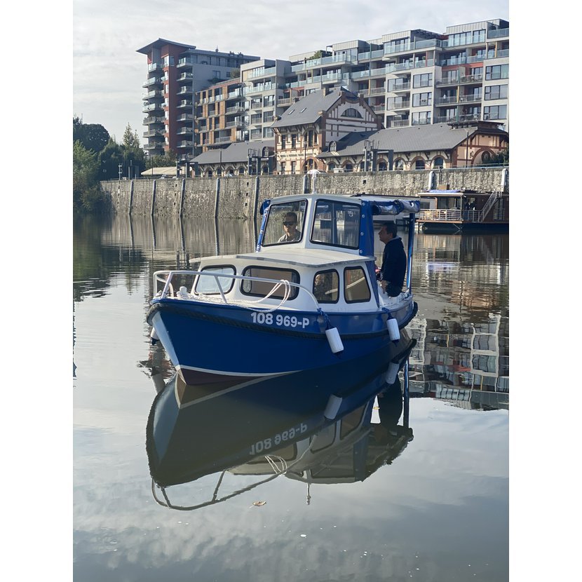 Technické parametry: délka 6,5m, šířka 2m, ponor 0,85m, závěsný motor, řízení klasickým kormidelním kolem