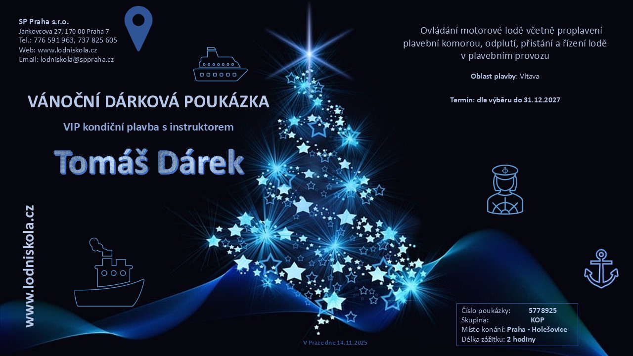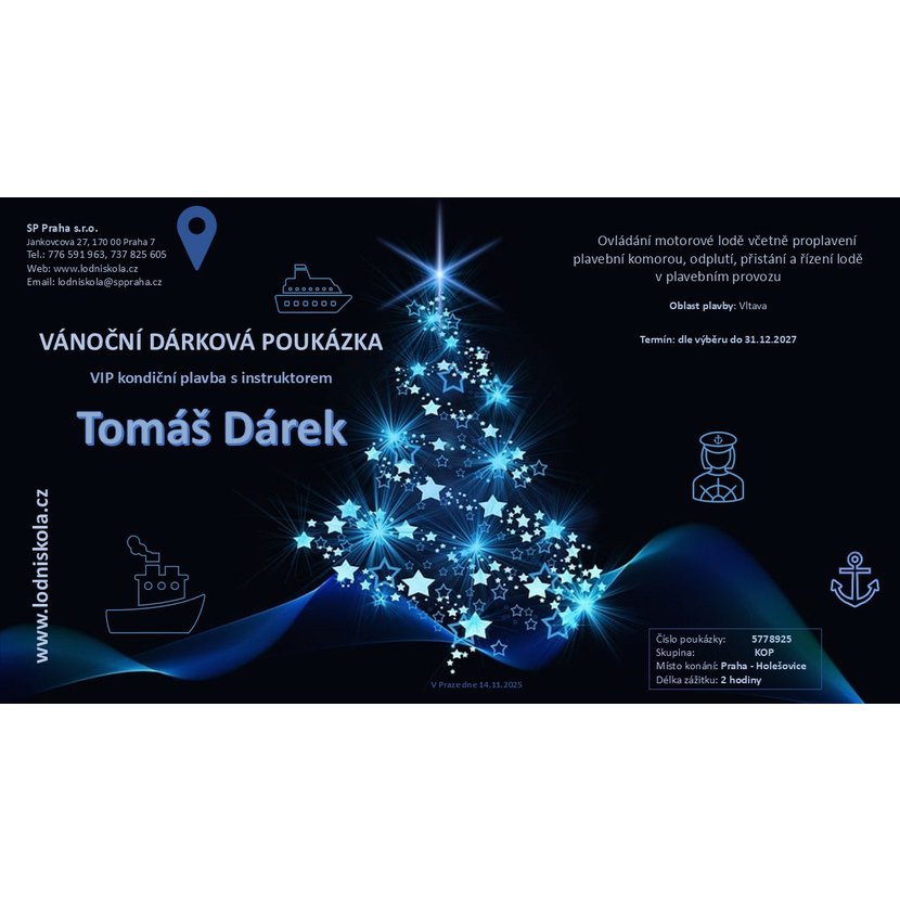 Darujte pod stromeček originální a jedinečný zážitek pro všechny milovníky lodí a vodního dobrodružství! Překvapte obdarovaného naší dárkovou poukázkou na VIP kondiční plavbu, během které si pod dohledem zkušeného instruktora osvěží vlastnoruční ovládání motorové lodě včetně proplavení plavební komorou, odplutí, přistání a řízení lodě v plavebním provozu. Zážitek je vhodný pro všechny vůdce malých plavidel, kteří si nejsou ještě za kormidlem tak úplně jisti.