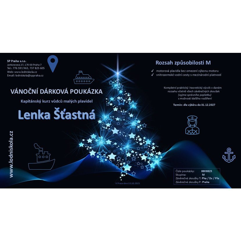 Uvažujete o originálním vánočním dárku s nádechem romantiky a dobrodružství? Máme pro Vás řešení! Dárkové poukázky na kapitánské kurzy Lodní školy nadchnou všechny milovníky neobyčejných zážitků. Pořídit si lodní řidičák u Lodní školy SP Praha, to není jenom biflování předpisů. Je to především hromada zážitků za kormidlem školních lodí, proplouvání atraktivním prostředím historického centra Prahy, spousta nových poznatků i dovedností... Absolvent Lodní školy pak může řídit rekreační loď, motorový člun či vodní skútr bez omezení výkonu motoru na řekách, průplavech, jezerech a přehradách nejenom v České republice, ale i v zahraničí.