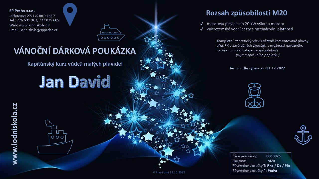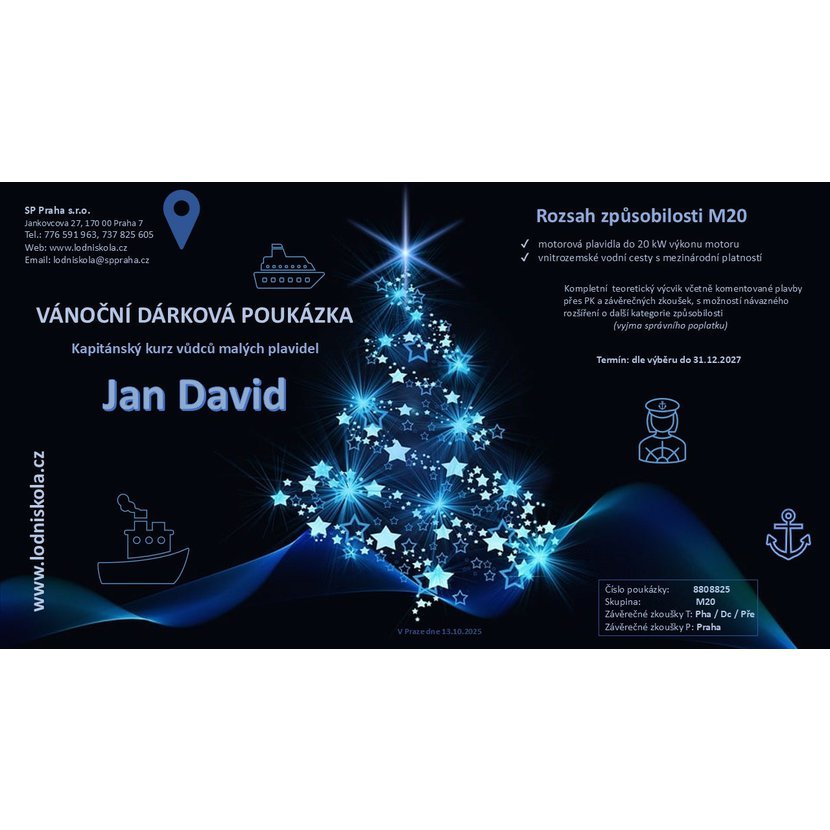 Uvažujete o originálním dárku s nádechem romantiky a dobrodružství? Máme pro Vás řešení! Dárkové poukázky na kapitánské kurzy Lodní školy nadchnou všechny milovníky neobyčejných zážitků. Pořídit si lodní řidičák u Lodní školy SP Praha, to není jenom biflování předpisů. Je to především hromada zážitků, proplouvání atraktivním prostředím historického centra Prahy v rámci komentované plavby, spousta nových poznatků i dovedností... Absolvent Lodní školy se základním rozsahem způsobilosti M20 pak může řídit rekreační loď nebo člun do 20 kW výkonu motoru na řekách, průplavech, jezerech a přehradách nejenom v České republice, ale i v zahraničí. Samozřejmá je možnost dalšího návazného rozšíření o další stupně způsobilosti.