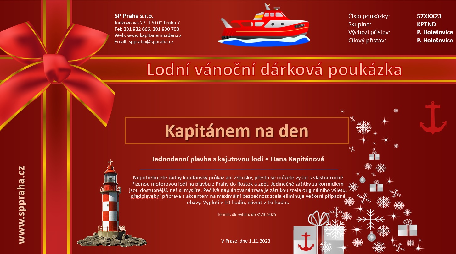 Vánoční dárková poukázka na jedinečnou zážitkovou plavbu po Vltavě. Staňte se alespoň na chvilku nefalšovaným kapitánem a vyražte na objevnou plavbu z Prahy do Roztok a zpět. Fantastická zábava pro děti i dospěláky. Nečekané zážitky pro celou rodinu na dosah ruky, řízení bez průkazu, bez zkoušek. Vše vás naučíme :-)